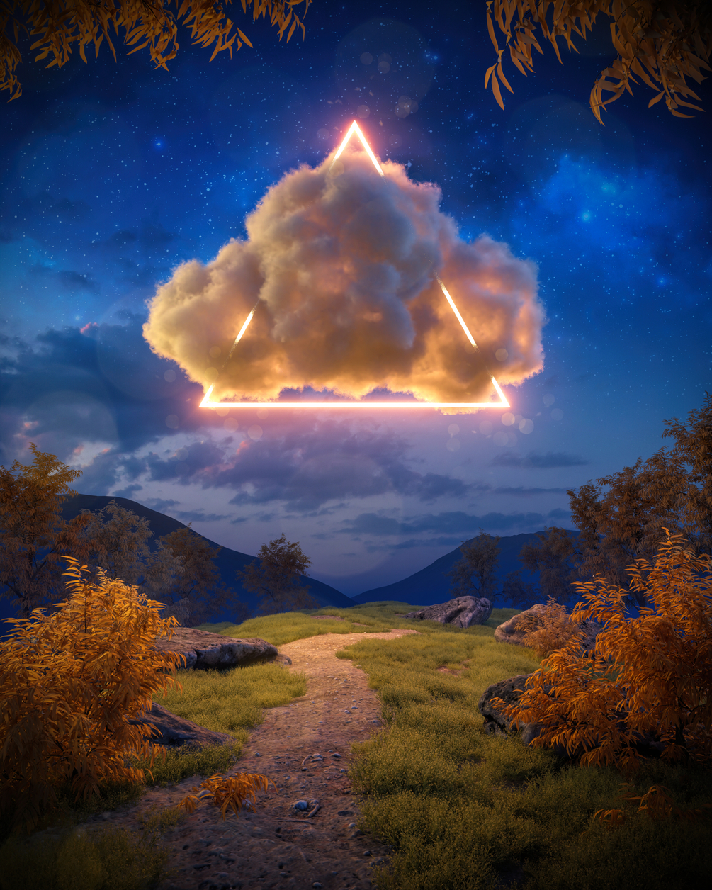One hour video walk through tutorial for C4D and Octane render, showing how to create this style image. Includes lots of tips and tricks for C4D and Octane, especially how to create clouds inside C4D carve a pathway and fine-tune lighting.